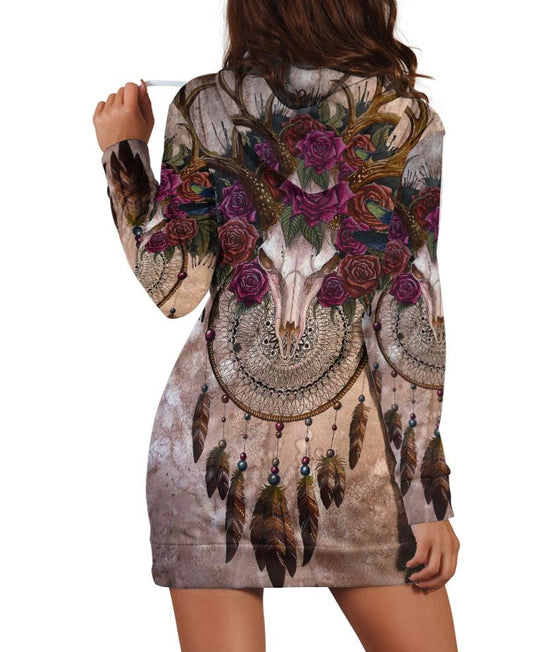 Feather & Buffalo Skull Hoodie Dress