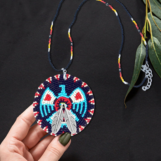 SALE 50% OFF - Dark Blue Thunderbird Beaded Patch Necklace Pendant Unisex With Native American Style