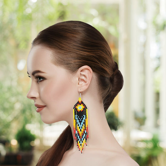 SALE 50% OFF - Black Multicolored Long Pattern Beaded Handmade Earrings For Women