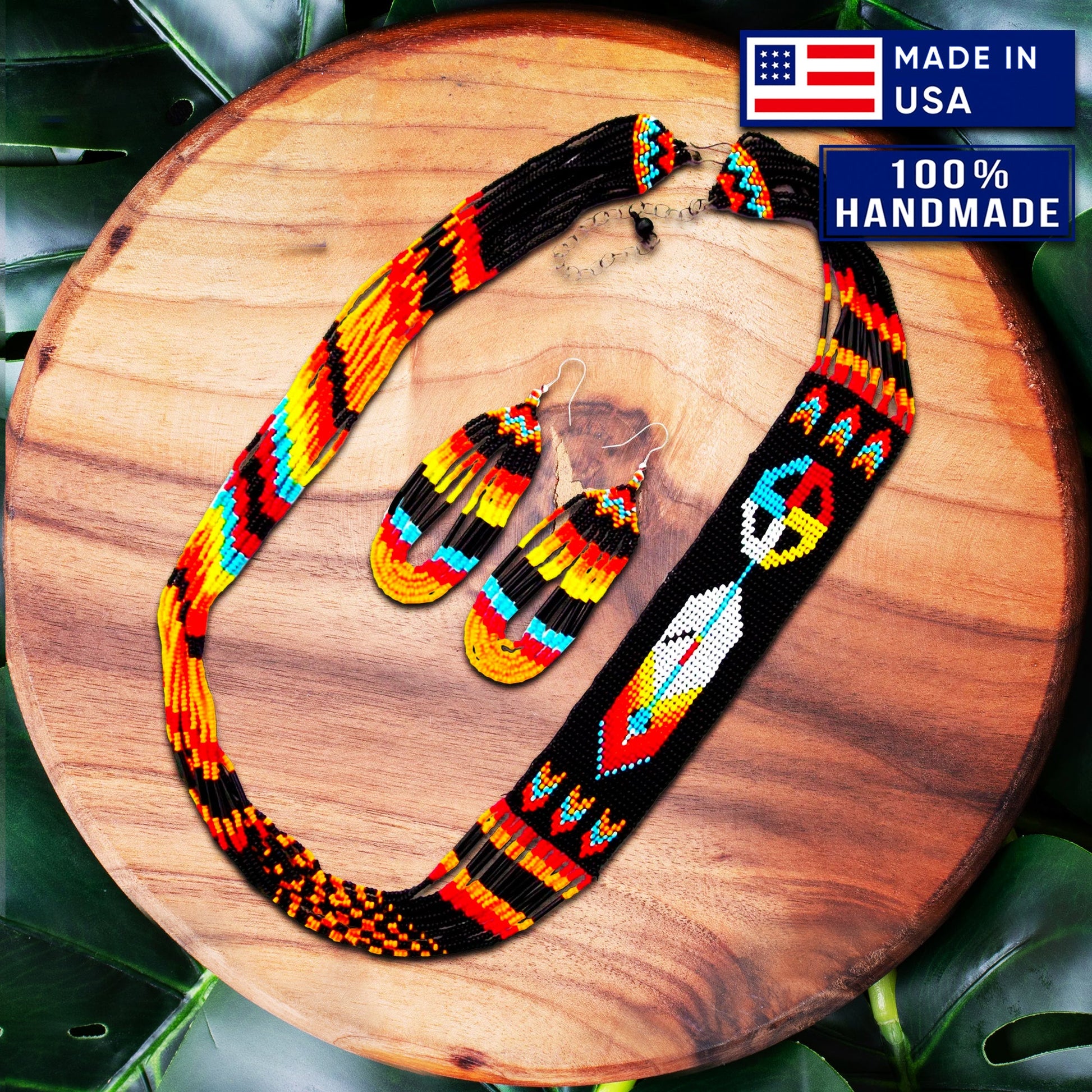 The necklace in a beaded Native American pattern Jewelry Set can come in different styles, such as a choker or a longer pendant necklace, and typically features a pendant that is also adorned with beads in a traditional Native American pattern.
