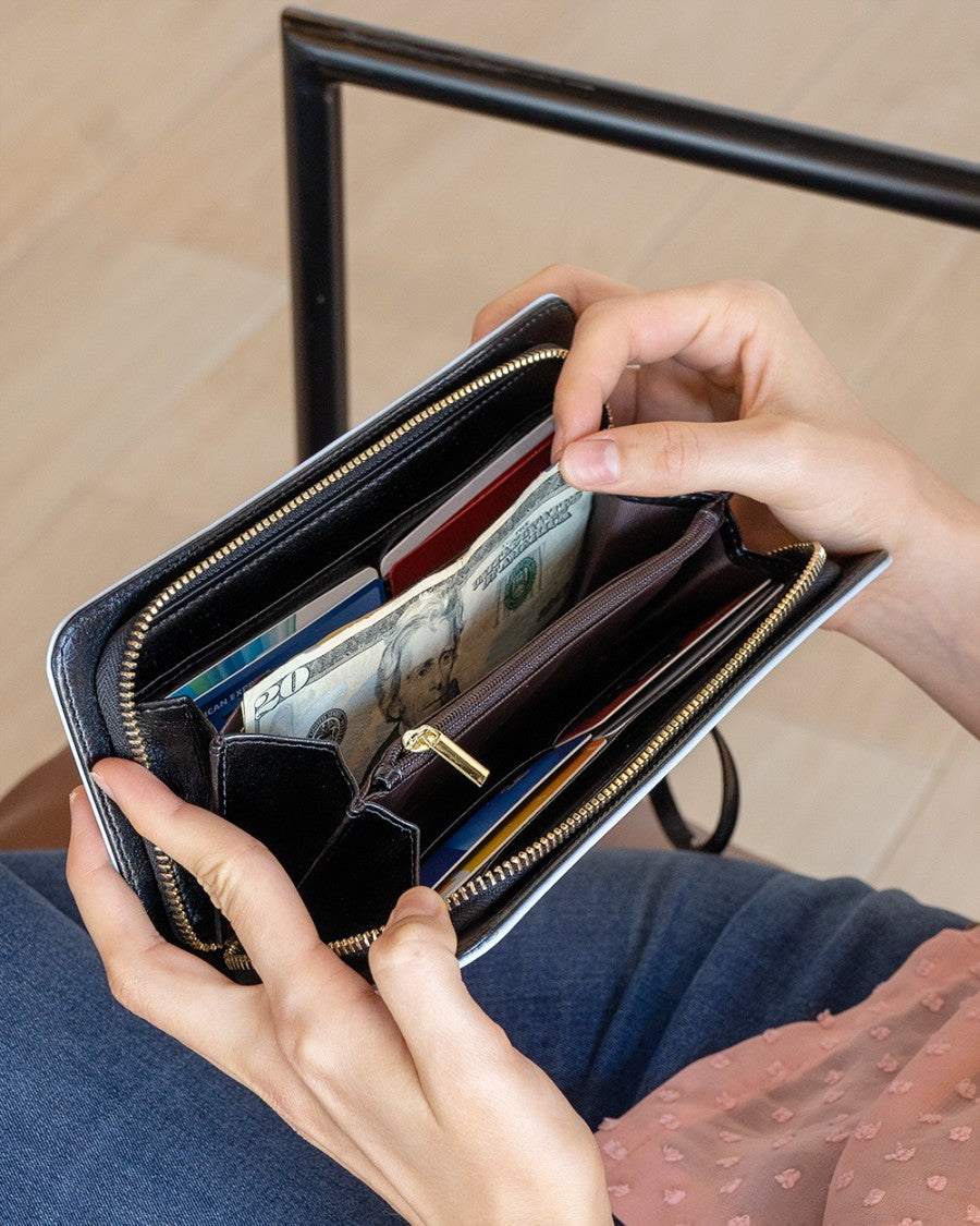 - Roomy interior features eight card slots, one zipper pocket, one phone pocket, and two full-length pockets