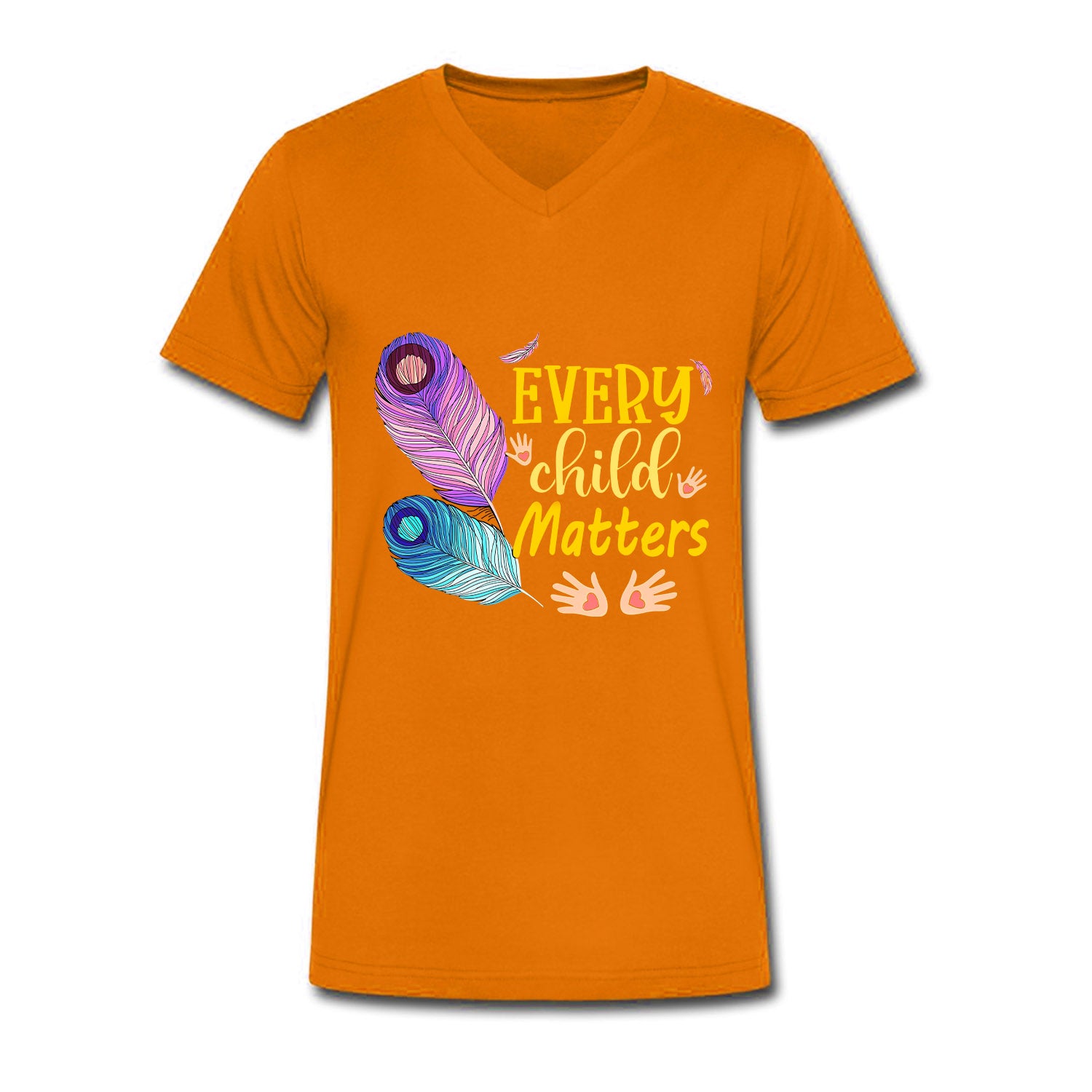 This colorful design features the message "EVERY Child Matters" with two vibrant feathers and handprints, symbolizing connection to nature and the importance of every child. The feathers, in shades of purple and blue, represent freedom, spirituality, and the diversity of Indigenous cultures. The playful font of the text adds a sense of hope and joy, while the handprints highlight the idea of care, protection, and community. The bright and lively colors convey a sense of urgency and positivity, making this design a powerful statement of remembrance and solidarity for Indigenous children.