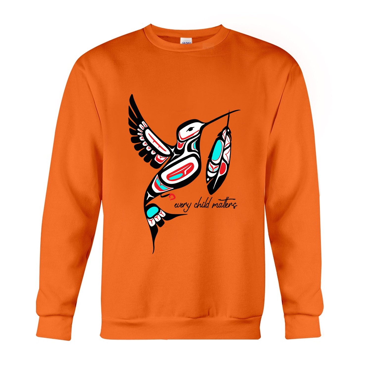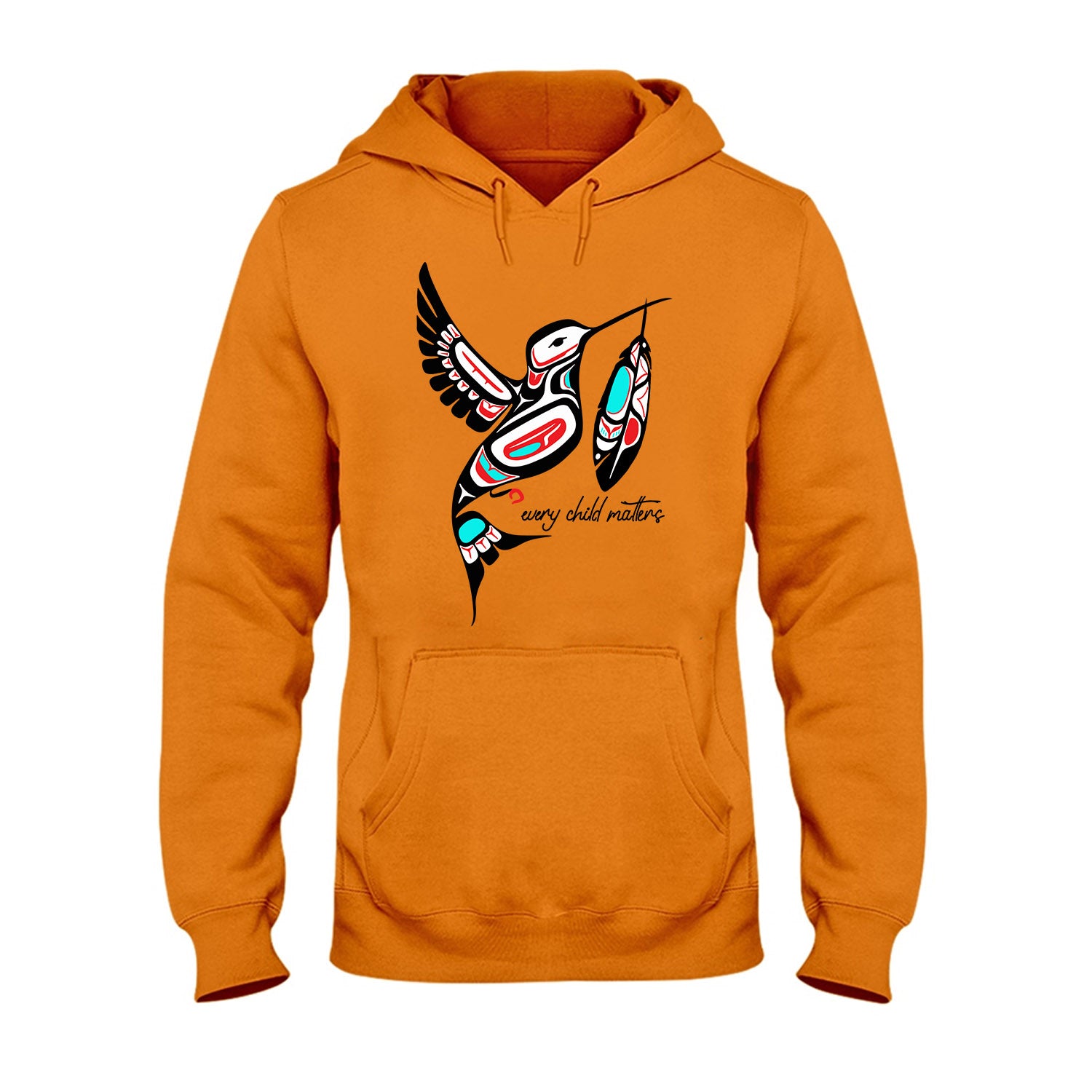 This vibrant design showcases the message "Every Child Matters" with a central figure of a hummingbird, intricately designed in a Native American-inspired art style. The hummingbird, depicted in motion, is holding a feather in its beak, symbolizing freedom, spirit, and connection with nature. The artwork is characterized by bold, flowing lines and vibrant colors, drawing attention to the spiritual significance of the bird in many Indigenous cultures. The bright orange background further emphasizes the importance of the Every Child Matters movement, honoring Indigenous children and their spirits.