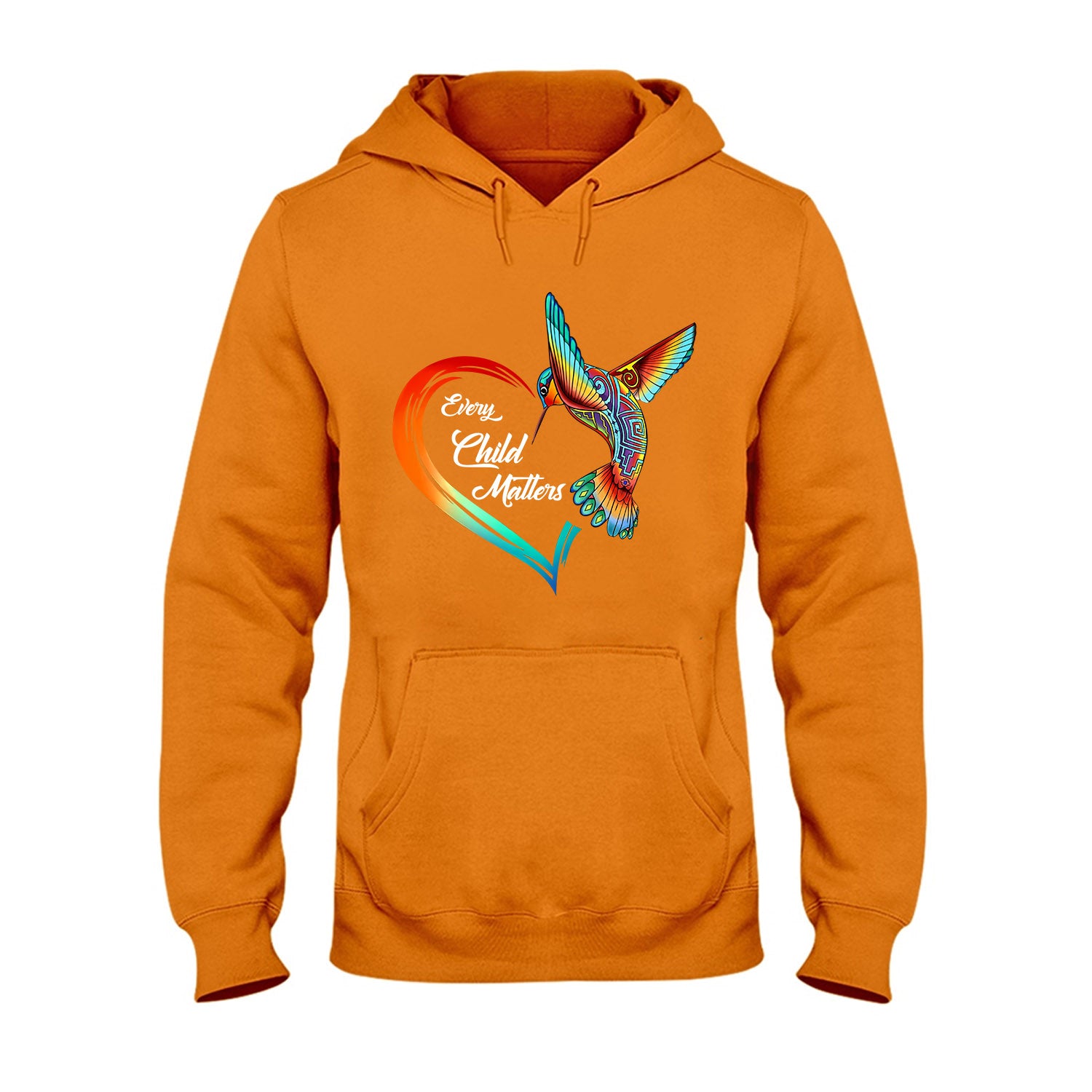 This colorful design features the message "Every Child Matters" with a vibrant heart shape formed by a hummingbird in mid-flight. The bird is beautifully detailed with intricate patterns, symbolizing freedom, spirituality, and connection to nature. The rainbow-like gradient of the heart creates a dynamic sense of warmth, love, and unity. The flowing lines of the design emphasize movement and energy, while the combination of the heart and bird reflects both hope and the importance of remembering and honoring every child, especially Indigenous children.