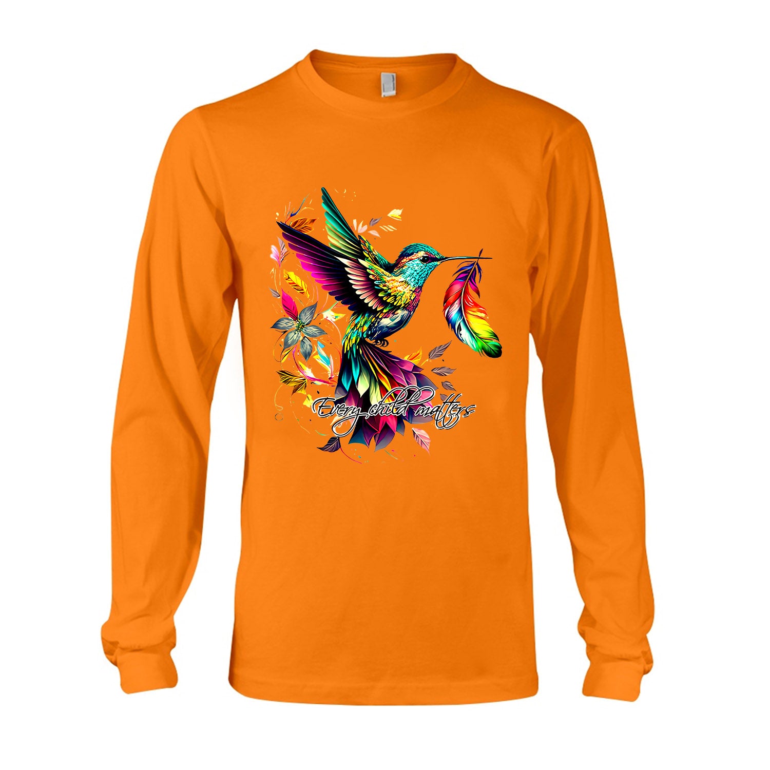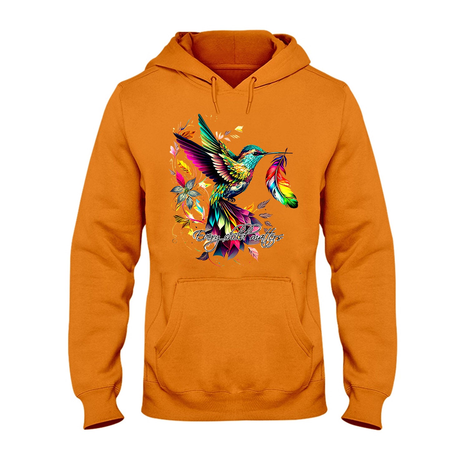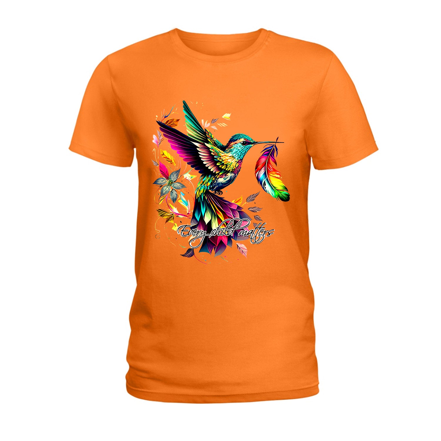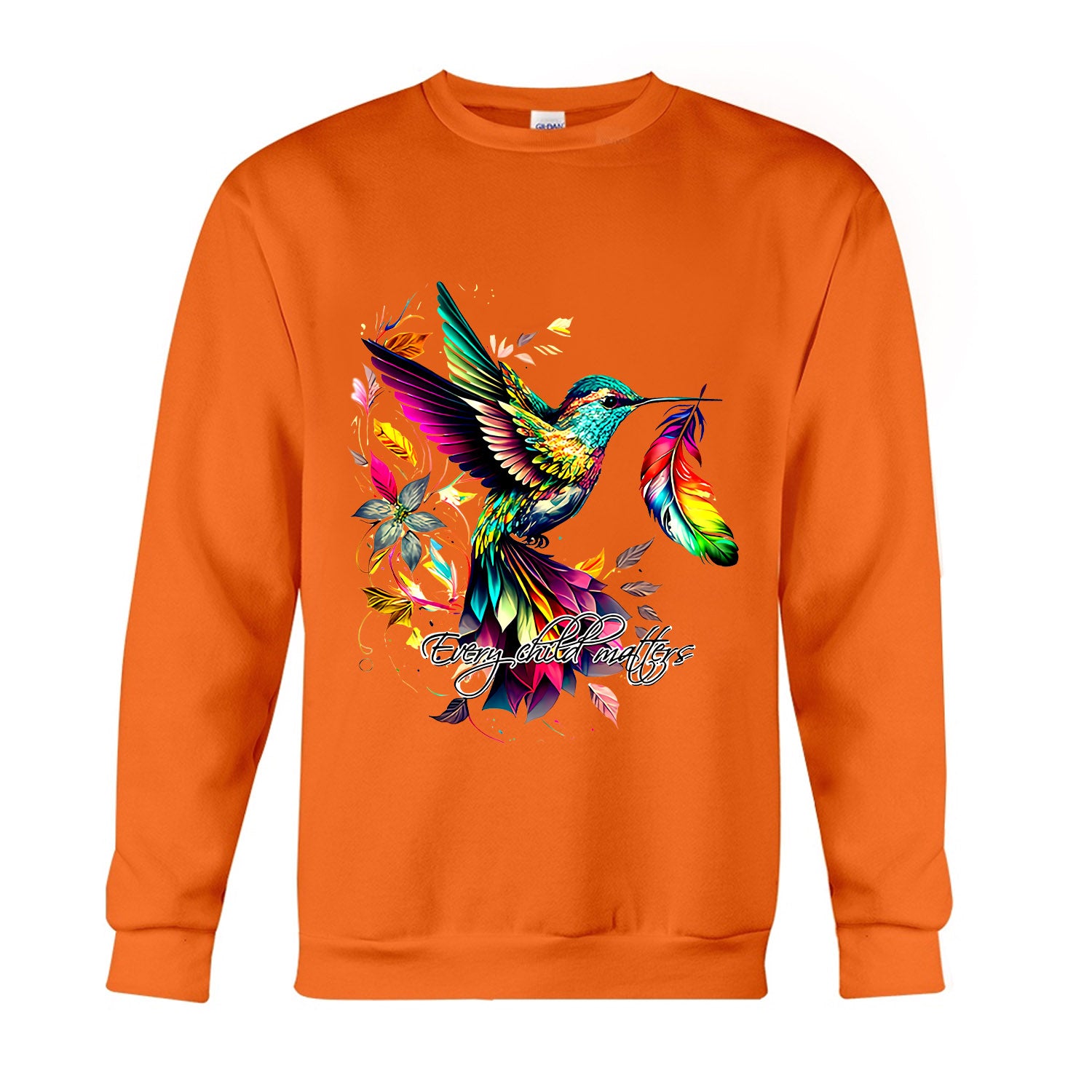 This vibrant design features a colorful hummingbird in mid-flight, gracefully holding a feather in its beak. The bird’s feathers are a stunning array of bright hues, radiating a sense of energy, movement, and life. Surrounding the bird are beautiful floral elements, adding a natural, organic touch to the artwork. The text "Every Child Matters" is delicately placed at the bottom, reinforcing the importance of remembering and honoring every child. The combination of dynamic colors, floral patterns, and the powerful message makes this design a vibrant tribute to both nature and the movement for justice for Indigenous children.
