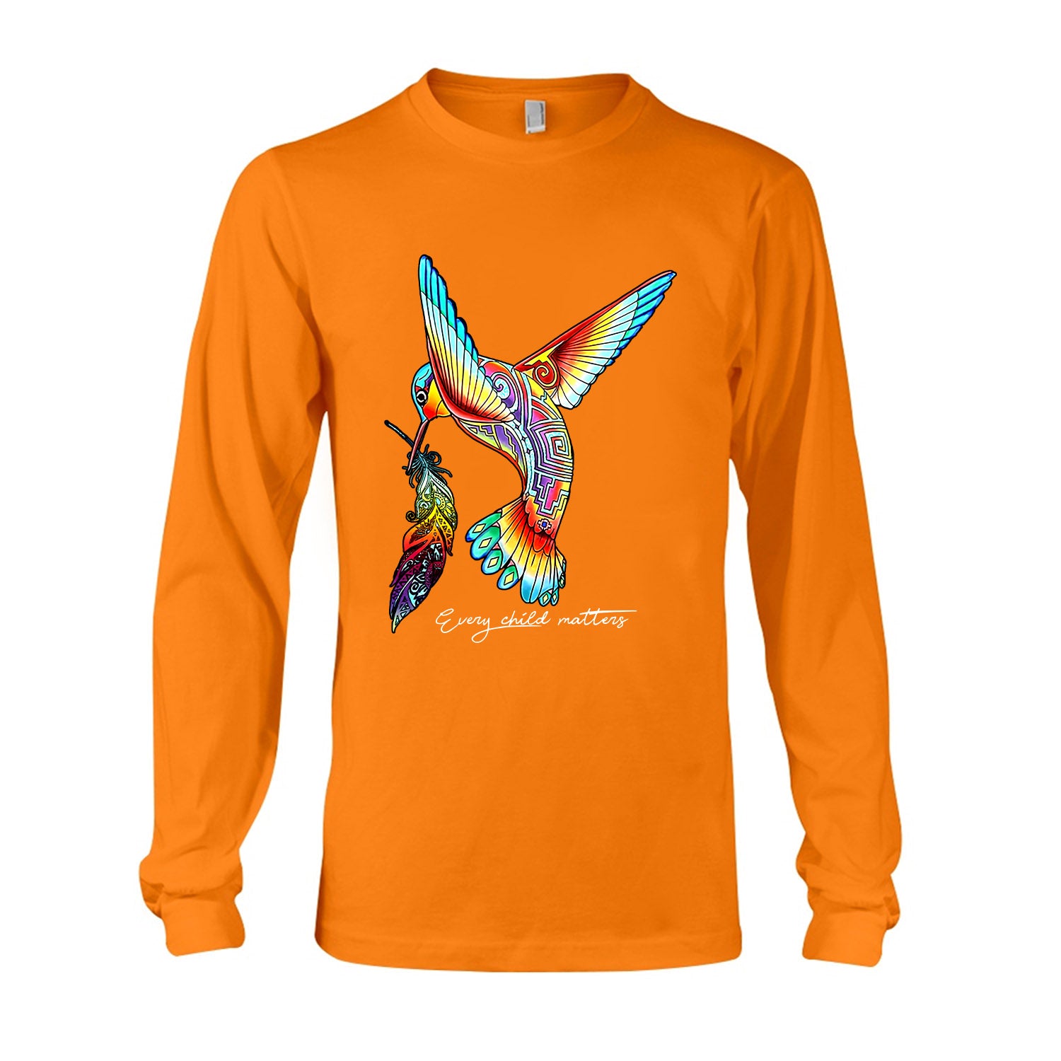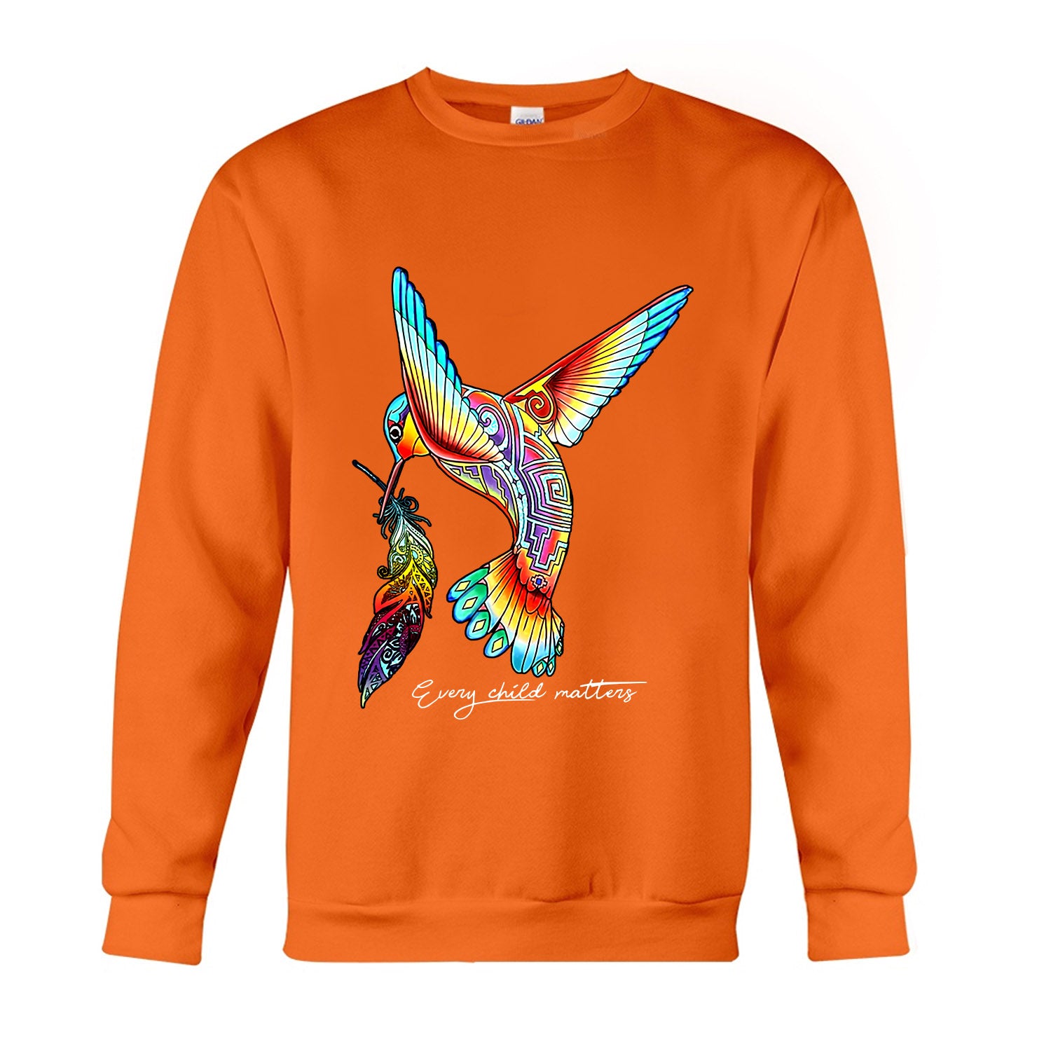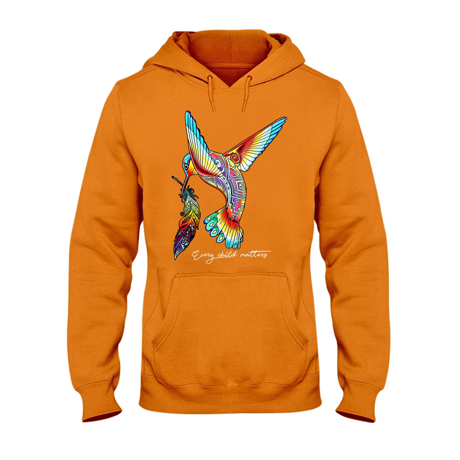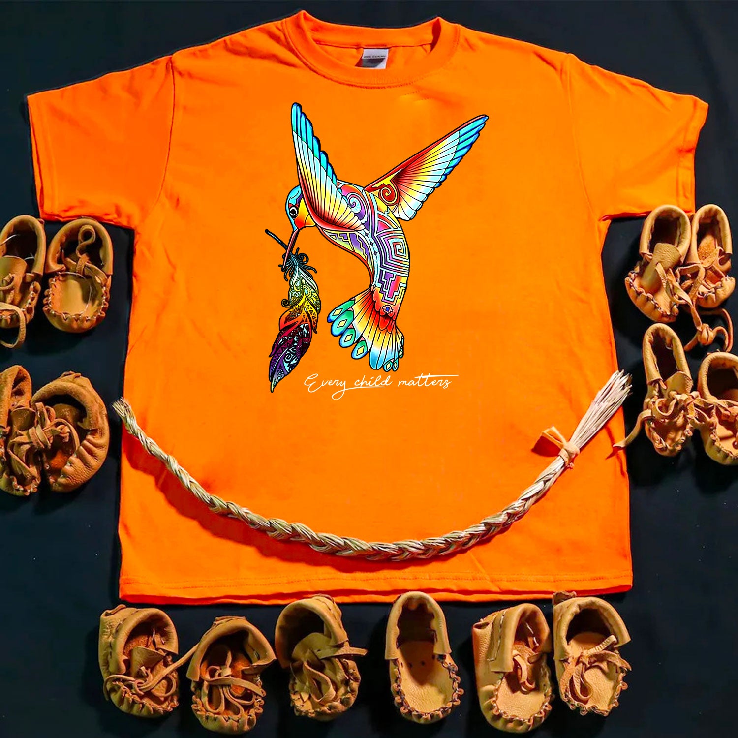 This vibrant design features a beautifully detailed hummingbird in mid-flight, holding a colorful feather in its beak. The bird's feathers are intricately decorated with bold geometric patterns, creating a striking visual effect that blends modern art with nature. The rainbow colors represent the diversity and unity of the world, while the feather symbolizes spiritual connection, respect, and remembrance. The message "Every child matters" is delicately placed below, reinforcing the importance of remembering and honoring every child, especially Indigenous children. This design combines beauty, movement, and a powerful message of justice and remembrance.