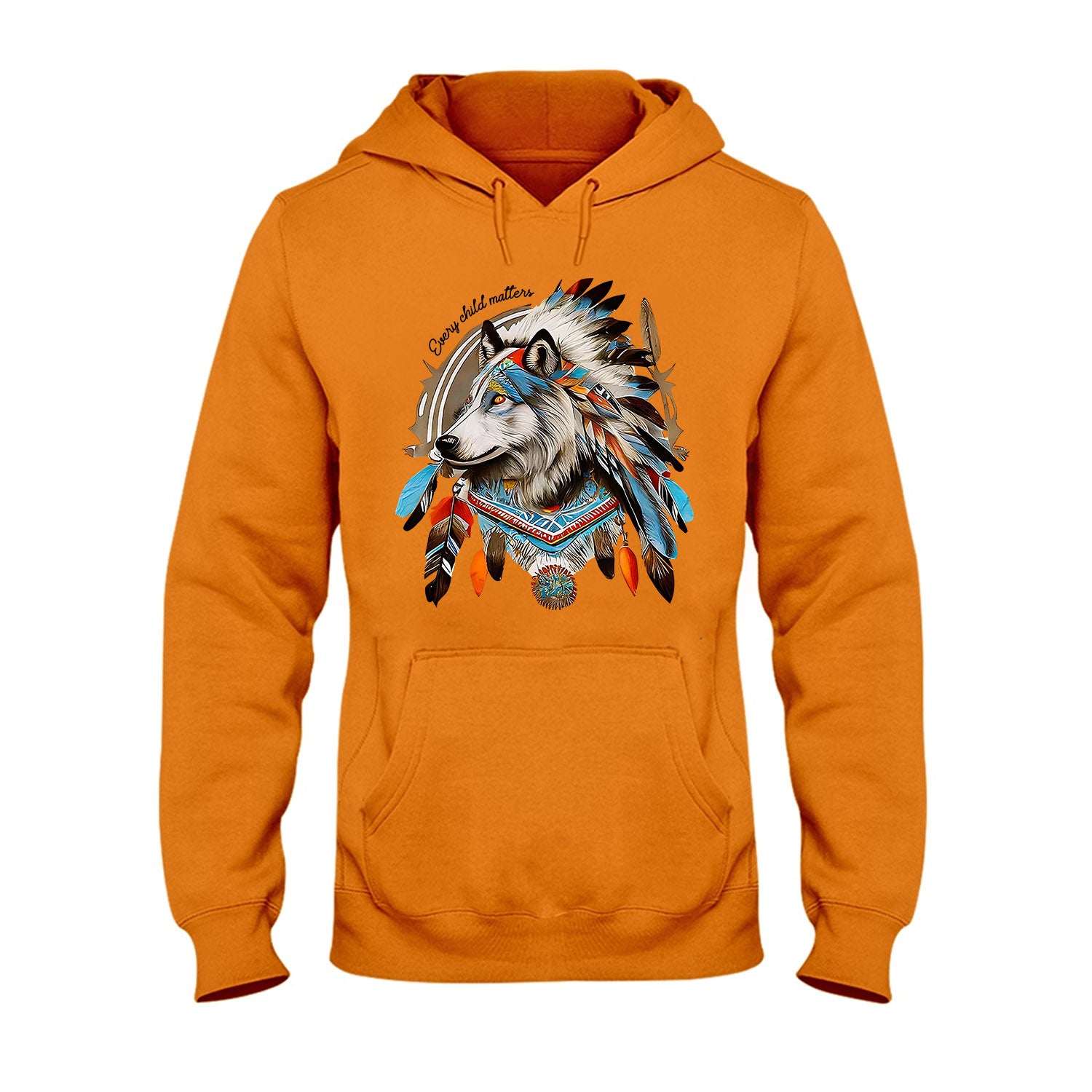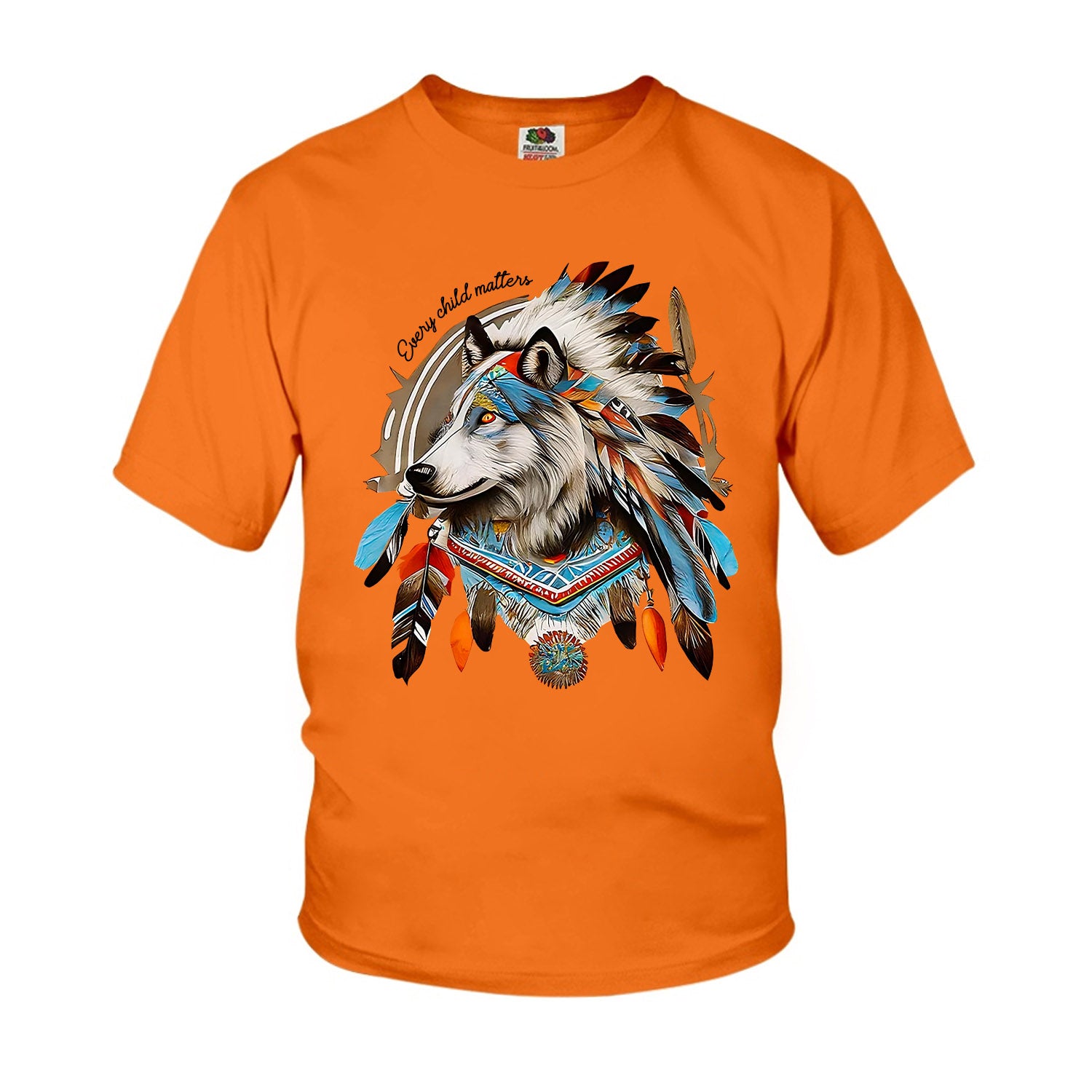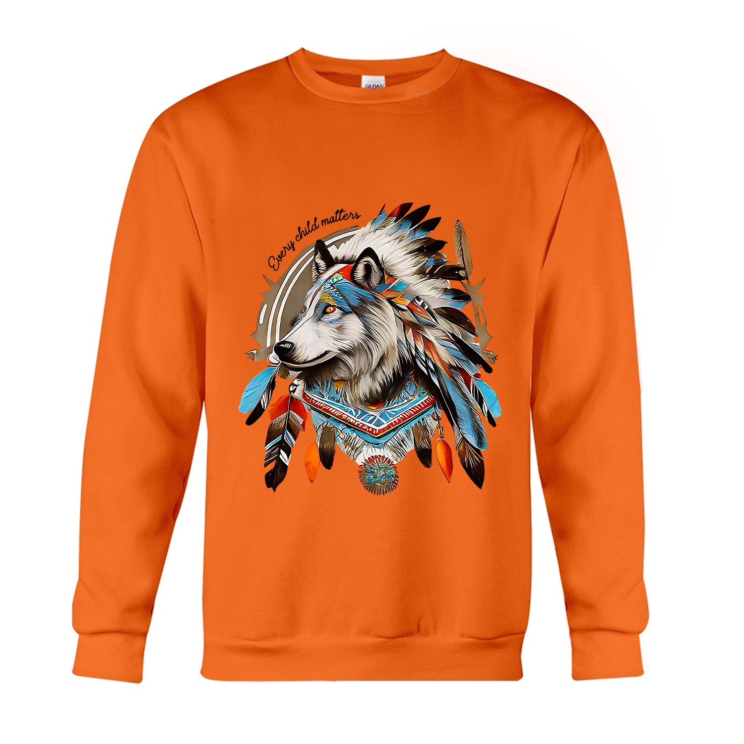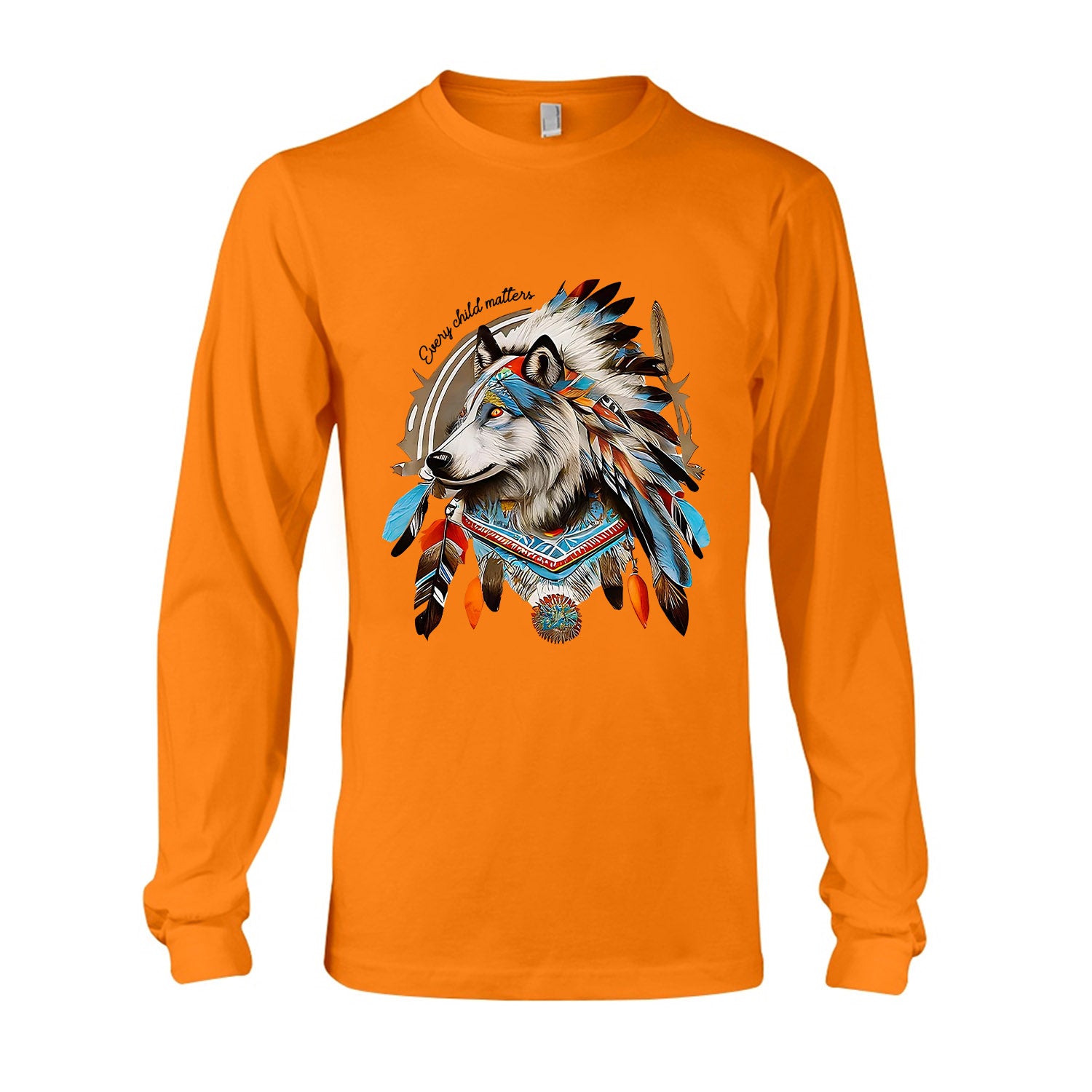 This design features a majestic wolf adorned with a traditional Indigenous headdress, emphasizing both strength and cultural pride. The wolf’s face is detailed with a sense of wisdom and resilience, while the vibrant feathers and beads of the headdress represent a deep connection to Native American traditions. The message "Every Child Matters" is elegantly integrated above the wolf, reinforcing the importance of remembering and honoring Indigenous children. The combination of bold colors, cultural symbolism, and the powerful presence of the wolf creates a striking tribute to the movement for justice and remembrance.
