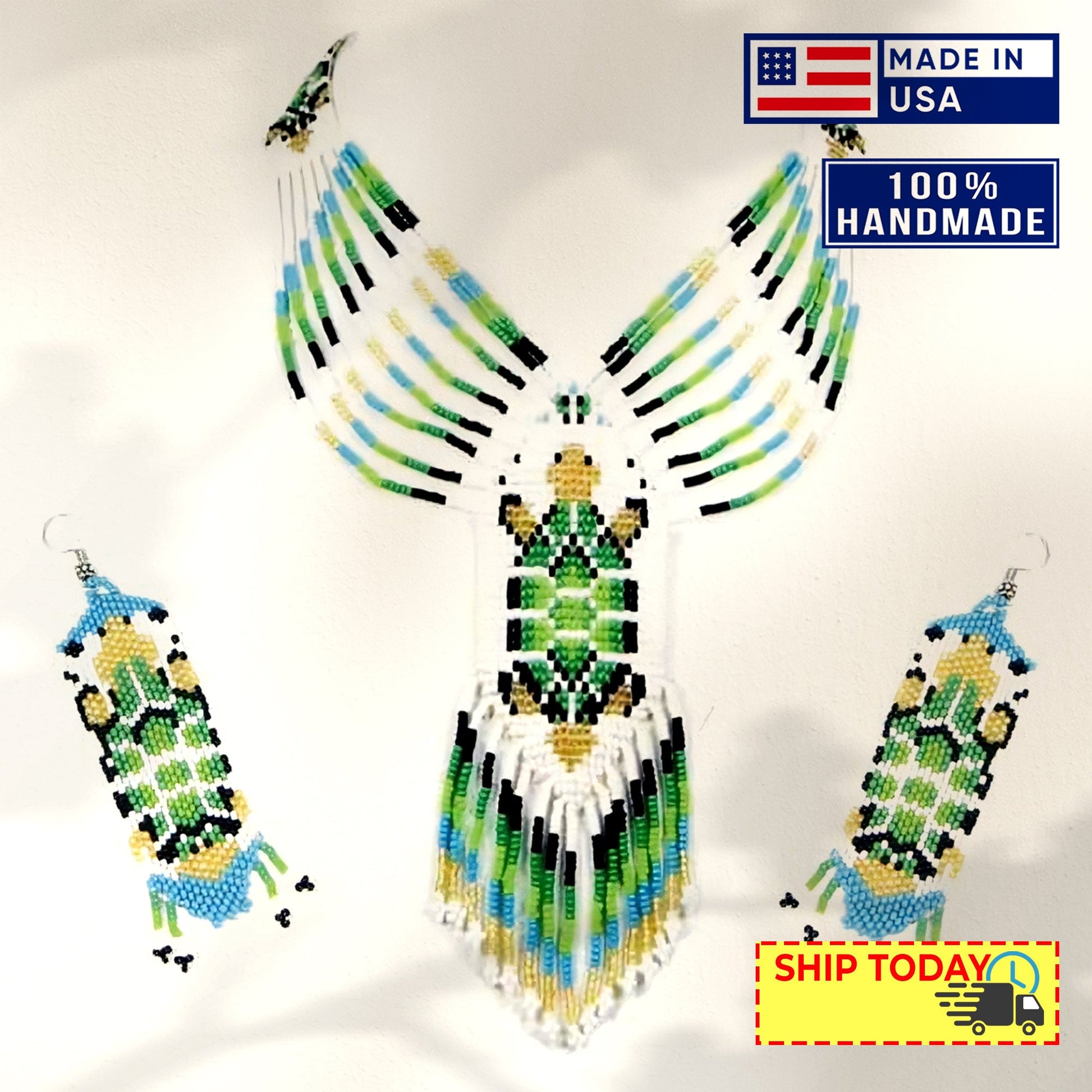 The necklace in a beaded Native American pattern Jewelry Set can come in different styles, such as a choker or a longer pendant necklace, and typically features a pendant that is also adorned with beads in a traditional Native American pattern.