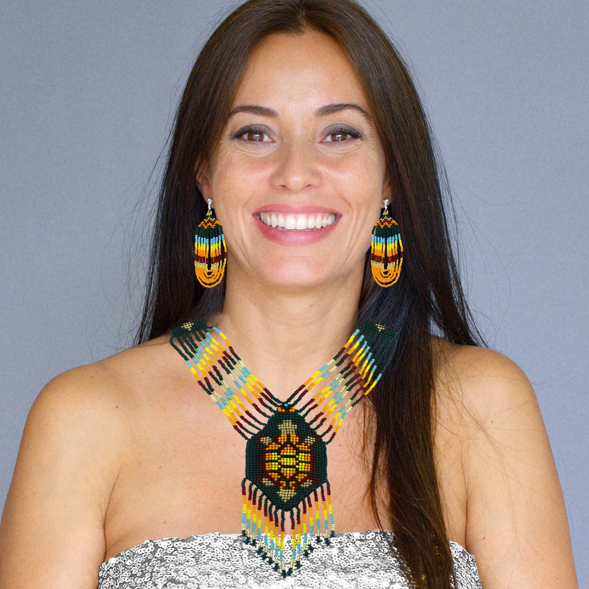 The necklace in a beaded Native American pattern Jewelry Set can come in different styles, such as a choker or a longer pendant necklace, and typically features a pendant that is also adorned with beads in a traditional Native American pattern.