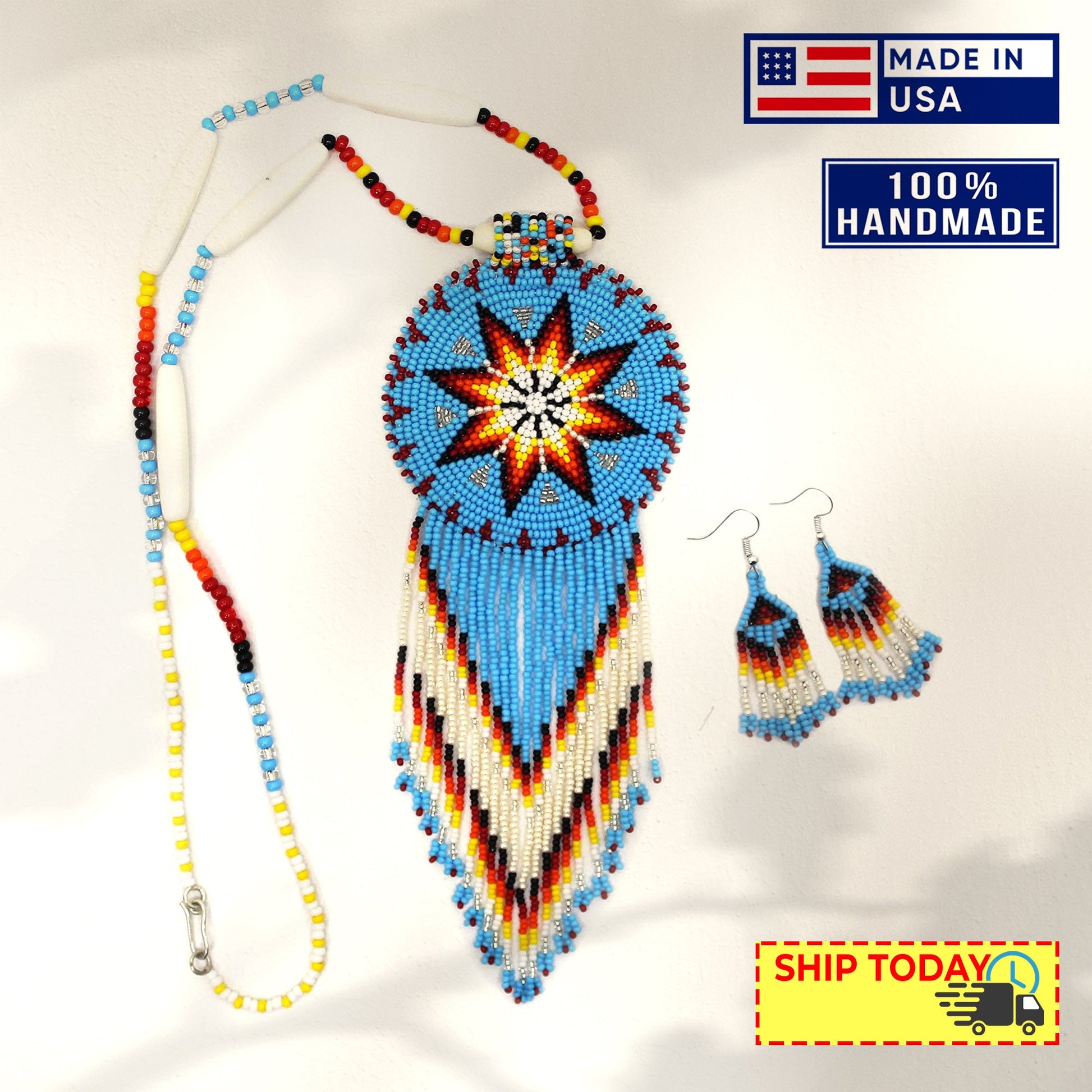 The necklace in a beaded Native American pattern Jewelry Set can come in different styles, such as a choker or a longer pendant necklace, and typically features a pendant that is also adorned with beads in a traditional Native American pattern.