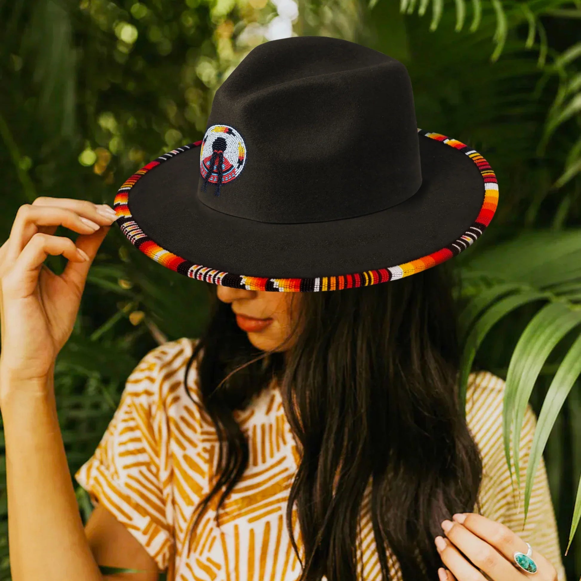 The Beaded Patch at the heart of the necklace is a true work of art, handcrafted with precision and adorned with intricate patterns that reflect the stories and heritage of Indigenous communities. Each bead is carefully chosen and threaded to create a visual tapestry that speaks of unity, spirituality, and cultural significance.