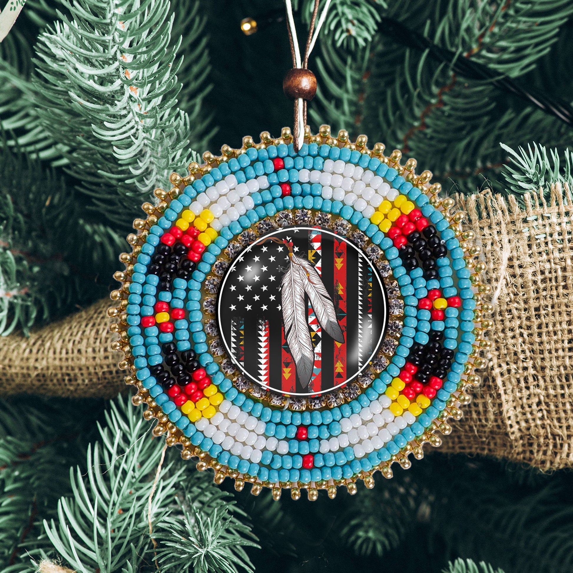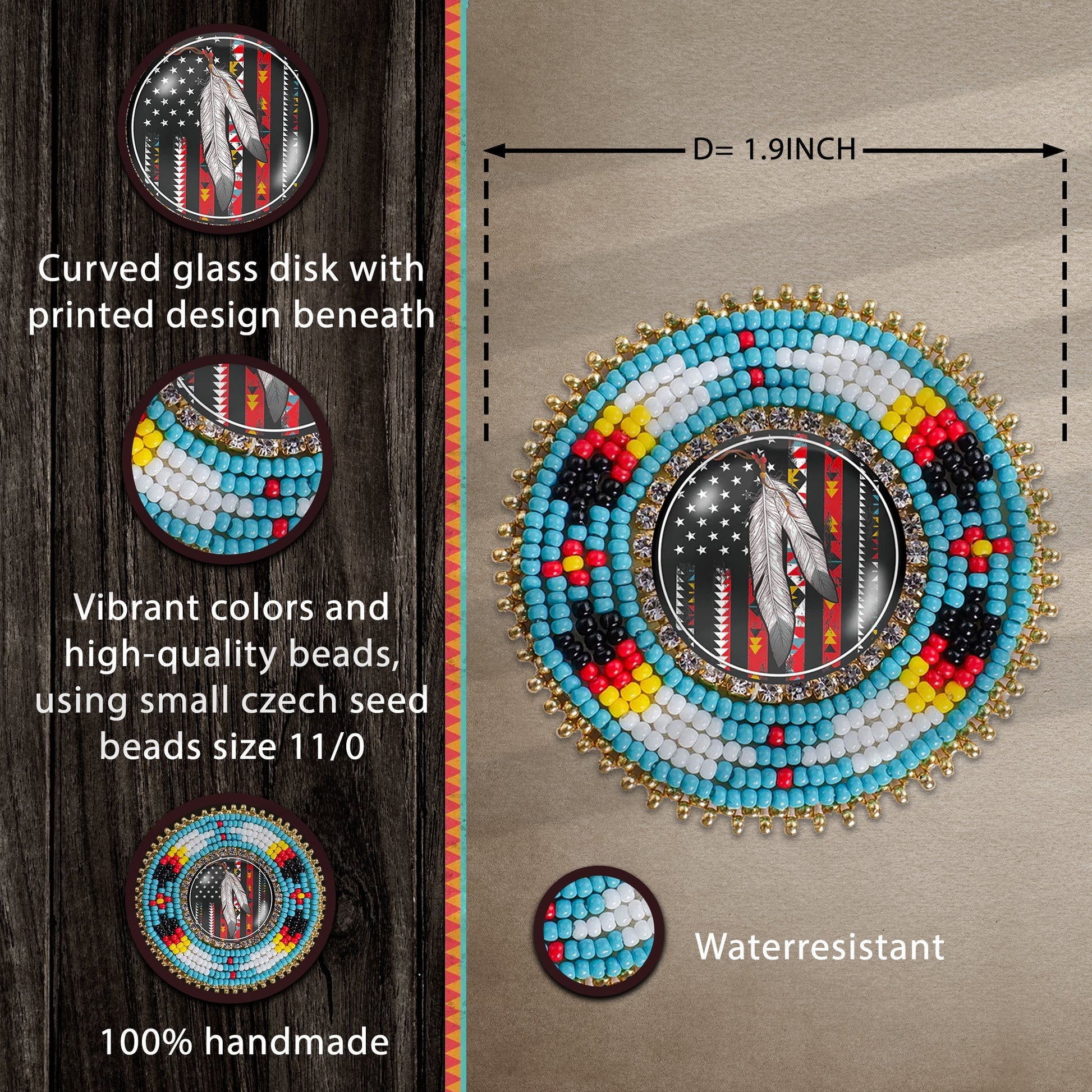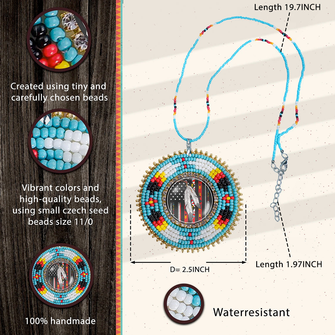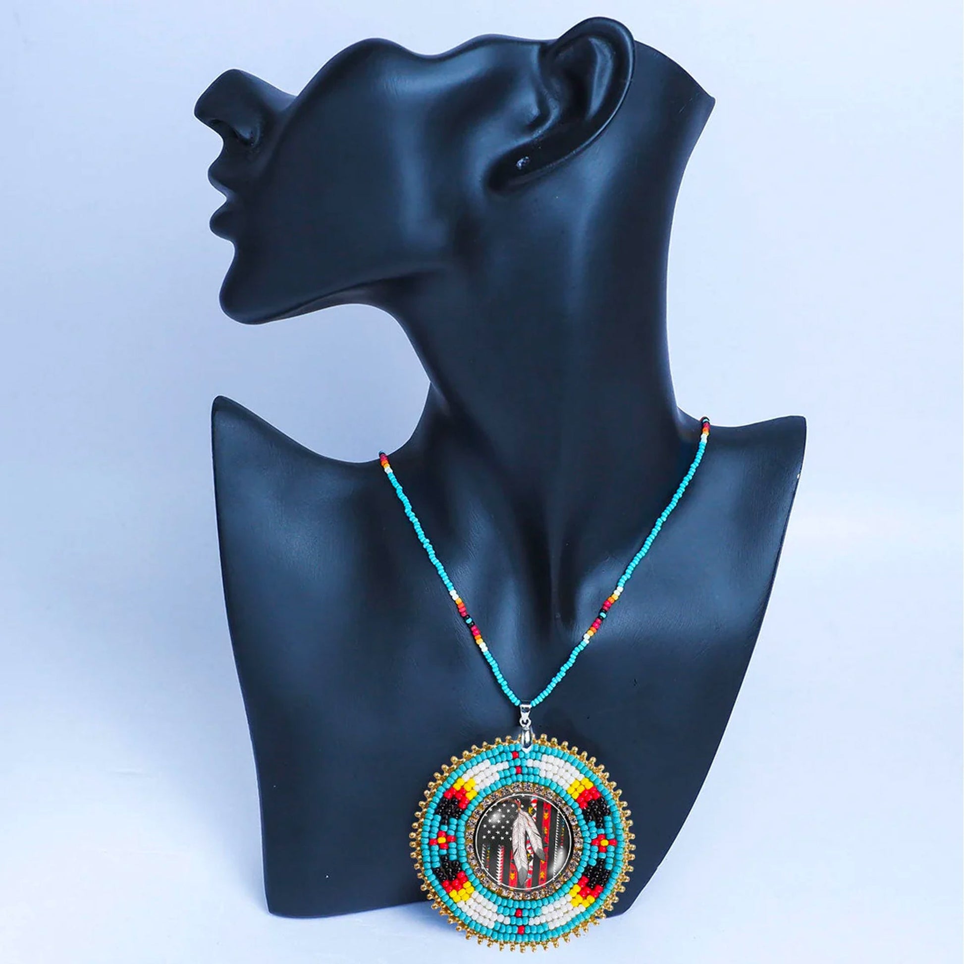 SALE 50% OFF - Native Flag Feathers Handmade Glass Beaded Patch Necklace Pendant