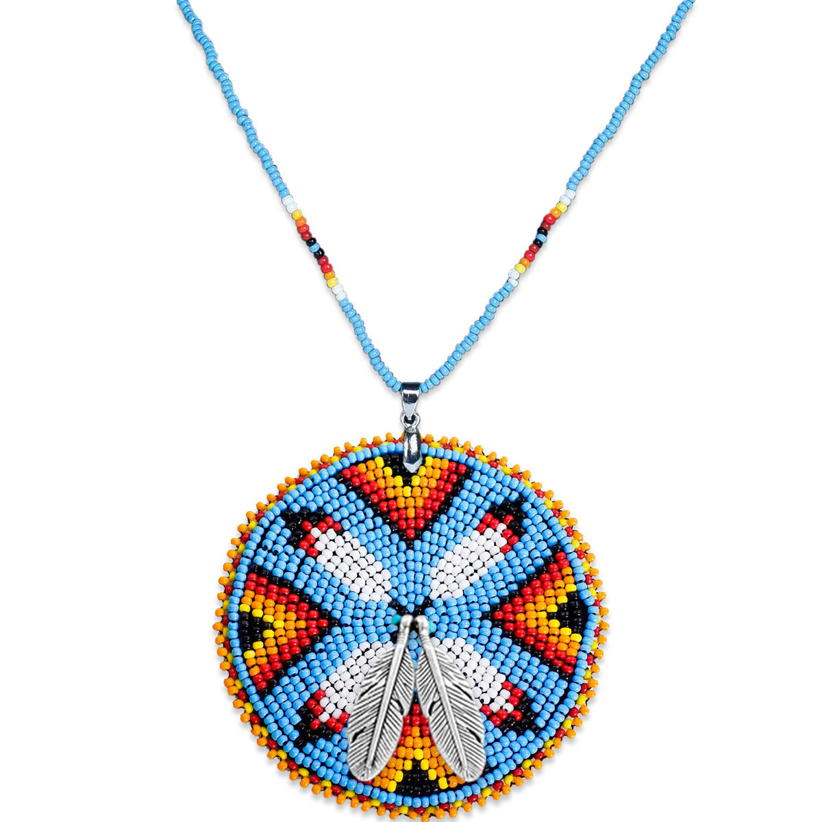 Introducing our exquisite Beaded Necklace featuring a captivating centerpiece in the form of a Beaded Patch, meticulously designed with reverence for Native American culture. This necklace beautifully marries the timeless elegance of a beaded accessory with the profound symbolism of Indigenous craftsmanship.
