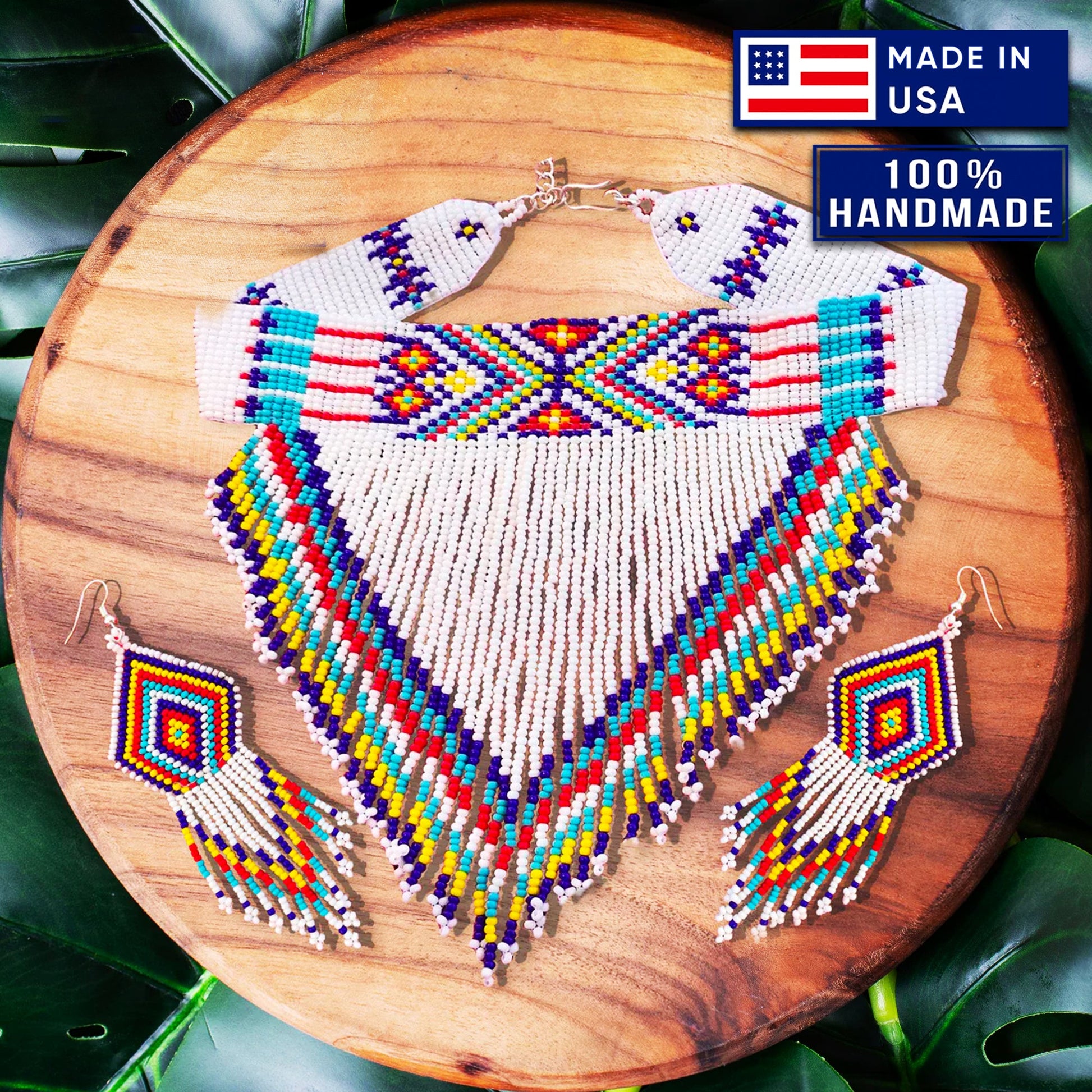 A set of beaded Native American pattern jewelry typically includes a matching pair of earrings and a necklace, both of which feature intricate designs inspired by traditional Native American motifs. The beads used in such sets are often made from beads