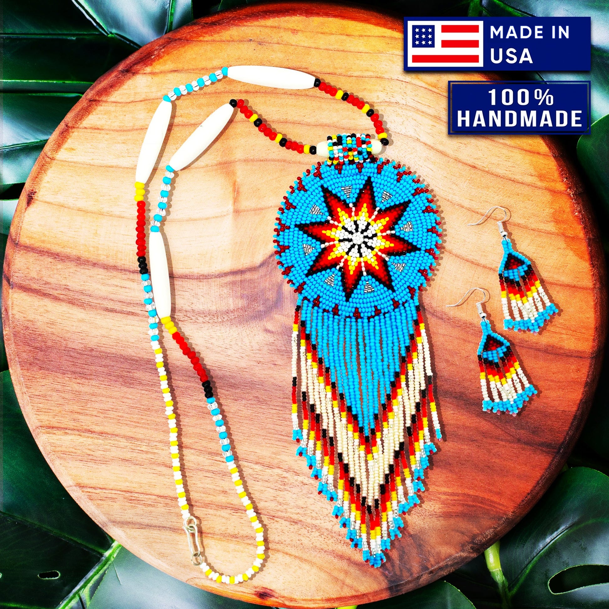 The necklace in a beaded Native American pattern Jewelry Set can come in different styles, such as a choker or a longer pendant necklace, and typically features a pendant that is also adorned with beads in a traditional Native American pattern.